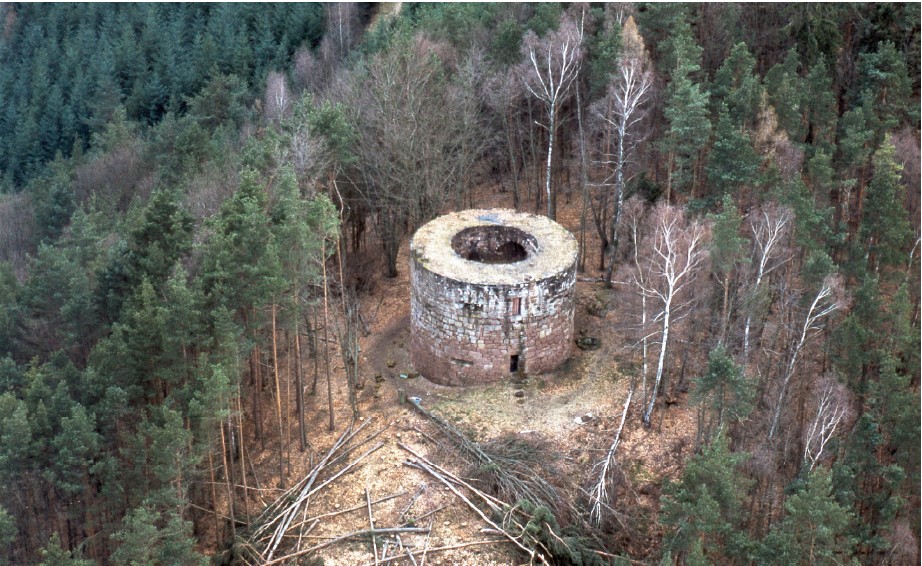 Kleinfrankreich, Luftaufnahme von Nordosten, 1996 (Aufnahme: Manfred Czerwinski, Institut für pfälzische Geschichte und Volkskunde)Die frühe Geschichte der Anlage ist ungeklärt, insbesondere ist das Entstehungsdatum unbekannt, denn für das in der Literatur häufi ger genannte Erbauungsdatum 1484 gibt es keinen konkreten Beleg. Allerdings lassen Bauform sowie der zeitgleiche Um- und Ausbau des Berwartsteins durch Hans von Trotha eine Entstehungszeit gegen Ende des 15. Kleinfrankreich Jahrhunderts möglich erscheinen. 1511 wird der Turm als „Thurm Frankreich“ in einem Vertrag zwischen Kurpfalz und Christoph von Trotha, dem Sohn des mutmaßlichen Erbauers, genannt. Erwähnt werden der Turm, die Gebäude, die Zugehörungen und der Berg, auf dem er steht.