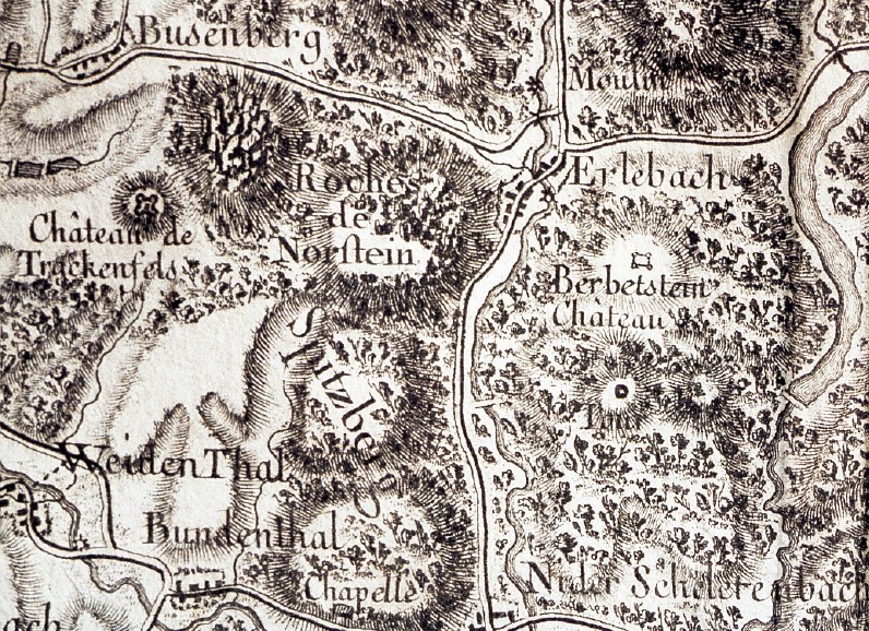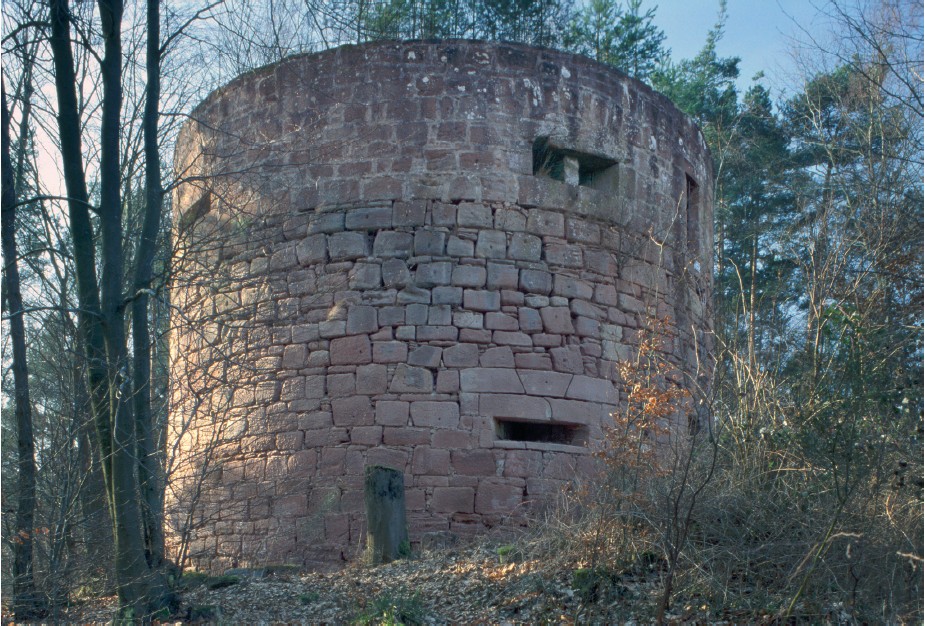 Kleinfrankreich, 1674/ 75-1715 (Ausschnitt aus: BEAURAIN 1782, Bl. 4; Slg. Willi Fallot- Burghardt; Repro: Bärbel Fallot-Burghardt,2005)Sechs Schießscharten, drei in jedem Stockwerk, sind in die Mauer eingefügt. Zwei Luft und Lichtschlitze durchbrechen die Mauer vom ersten Stockwerk nach schräg oben. Die Schießscharten haben querrechteckige Ausschussöffnungen mit steinernen Sturzbalken. Die Wände sind geschrägt, die inneren Öffnungen sind hochrechteckig. Mauerkanäle dienten für die Verschlussbalken der Schartenöffnungen. Die Scharten befi nden sich im Erdgeschoss in Stichbögennischen, im Obergeschoss sind sie rundbogig überwölbt. Diese Ebene ist gekuppelt in Ringschichtung abgeschlossen, die Scheitelöffnung ist quadratisch.