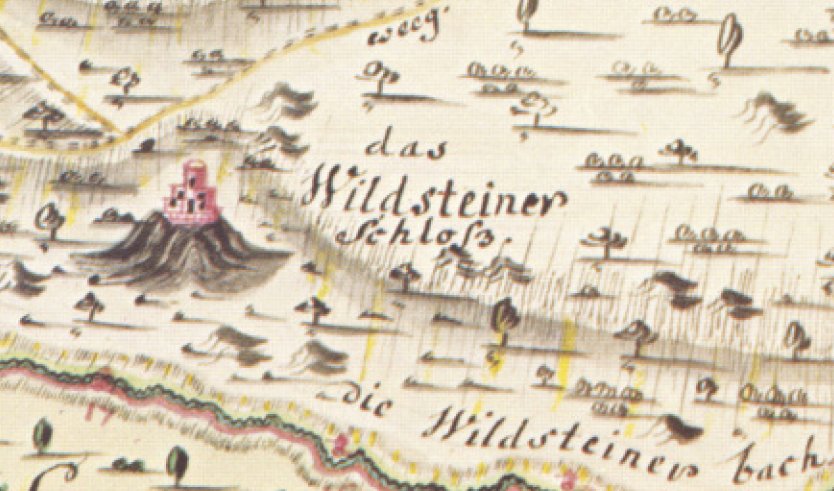 Verabredet wurde ferner auch, dass Siegfried zu Lebzeiten drei, Johann zwei Knechte zu stellen hatte. In Kriegszeiten sollte Johann sein Burgpersonal um einen Knecht aufstocken. Zudem wollten die Gemeiner drei Hunde auf der Burg halten. Im Falle des gemeinschaftlichen Verkaufs der Anlage sollte Johann oder seinen Erben ein Viertel des Verkaufspreises zufallen. Hieraus kann geschlossen werden, dass die Obersteiner ein Viertel der Anlage in Besitz hatten. Auch trafen die Gemeiner Vereinbarungen über die Aufteilung des unmittelbar bei der Burg gelegenen Gebiets (flecken und garten). Siegfried von Wildenstein hatte Pfalzgraf Ruprecht I. während der kriegerischen Auseinandersetzungen mit dem Erzbischof von Trier und den Städten am Niederrhein Enthalt in seinen Festen Wildenstein und Wartenberg (s.d.) gewährt. Dafür erhielt Siegfried 1360 vom Pfalzgrafen 150 Gulden Florentiner Währung. Nach Fabricius nahmen 1364 die Söhne Johanns von Oberstein, Siegfried und Andreas, eine Teilung des Familienbesitzes vor, bei der Andreas den Obersteinschen Anteil von Wildenstein mit Zubehör erhielt. Diesen verpfändete er 1377 Adolf von Mainz, der als Elekt dem Mainzer Erzbistum vorstand. Eine 1362 in einer von Philipp (VII.) von Bolanden, Herrn von Altenbaumburg, seiner Frau Imagina von Leiningen-Dagsburg sowie seinem Bruder Konrad für Graf Walram von Sponheim ausgestellten Urkunde genannte Burg Wielnsteyn (RGfSponheim 1240, S. 690f.) ist aus namenkundlichen Erwägungen wohl nicht mit der Burg am Donnersberg zu identifizieren. Es dürfte sich hierbei um Burg Wilenstein (s.d.) handeln. 1372 ist Siegfried von Wildenstein als Burgmann zu (Kaisers-) Lautern bezeugt (UBKL2, Nr. 262, S. 269). Sein gleichnamiger Sohn teilte 1389 mit Erlaubnis Pfalzgraf Ruprechts I. das Lauterer Burglehen mit dem ihm verwandten Siegfried von Oberstein (ebd. 346, S. 320f.). Im Übrigen besaßen beide Herren 1393 gemeinschaftlich ein Burglehen zu Alzey (Lehnsbuch Pfalzgrafen 114, S. 139 u. Nr. 148f., S. 145). Bereits zuvor war es zum Krieg zwischen den Städten Mainz, Worms und Speyer einerseits und den Pfalzgrafen Ruprecht d. Ä. und d. J. andererseits gekommen. In diesem Zusammenhang verzichtete Siegfried von Wildenstein 1390 ausdrücklich auf Ersatz der Schäden gegenüber den Städten (UBWO 2, Nr. 954, S. 623f.). Wildenstein wird in diesem Zusammenhang nicht genannt.