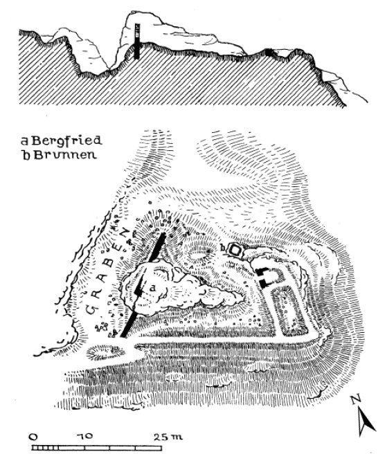 Vom einst auf dem Felsrücken platzierten Bergfried sind heute keinerlei Mauerreste mehr erhalten. Während die südlich verlaufende Schildmauer nur eine Stärke von 110 Zentimetern aufweist, hat der nördliche Mauerabschnitt eine Stärke von 170 Zentimetern. Bei genauer Betrachtung erweist sich der dortige vermeintliche Mauerabbruch als die Nordecke der Schildmauer. Ihr abknickender Verlauf nach Osten ist durch ein weiteres Mauerstück nachweisbar. Eine Erklärung für ein weiteres, etwa in der Flucht der Schildmauer, jedoch tiefer befi ndliches Mauerfragment fehlt daher zur Zeit.