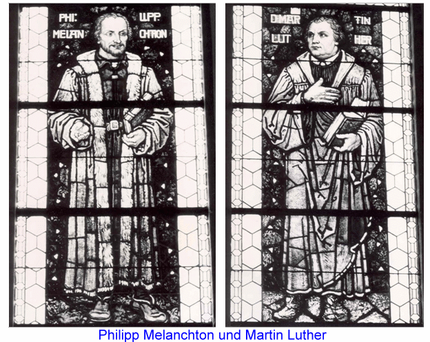 4. 2 seitl. Fenster mit Einzelfig. Luther & Melanchton als Vollbilder wie vor p. Stk. 380,- MK