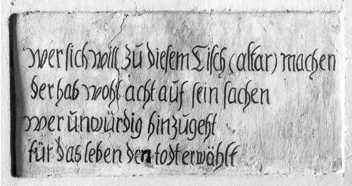 Weniger im Blickfang der Gemeinde steht die jüngere Inschrift. Im großen lateinischen Buchstaben des späten 16. oder frühen 17. Jahrhunderts ist sie oben auf der Längsempore erhalten: