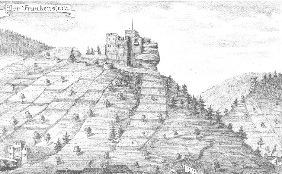 Die 70 Meter über dem gleichnamigen Dorf gelegene Ruine Frankenstein ist frei zugänglich.