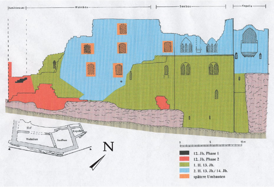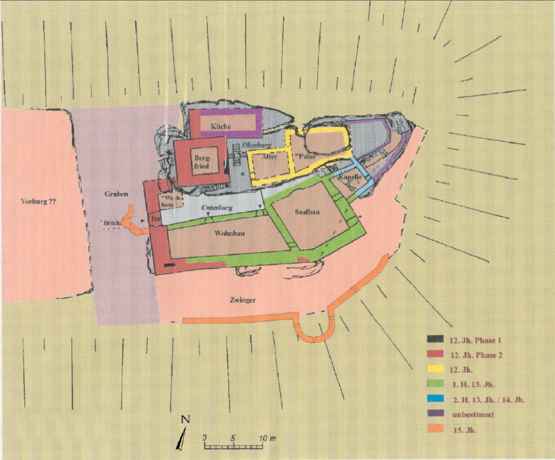 Einige Bauteile wie die sogenannte „Küche“ am Bergfried, die Bebauung der nordöstlichen Oberburg und die Zwingermauer lassen sich ohne weitere Ausgrabungen wohl kaum genauer zeitlich einordnen. An den Überresten der „Küche“ können ohne weiteres zwei bis drei Umbauten abgelesen werden.